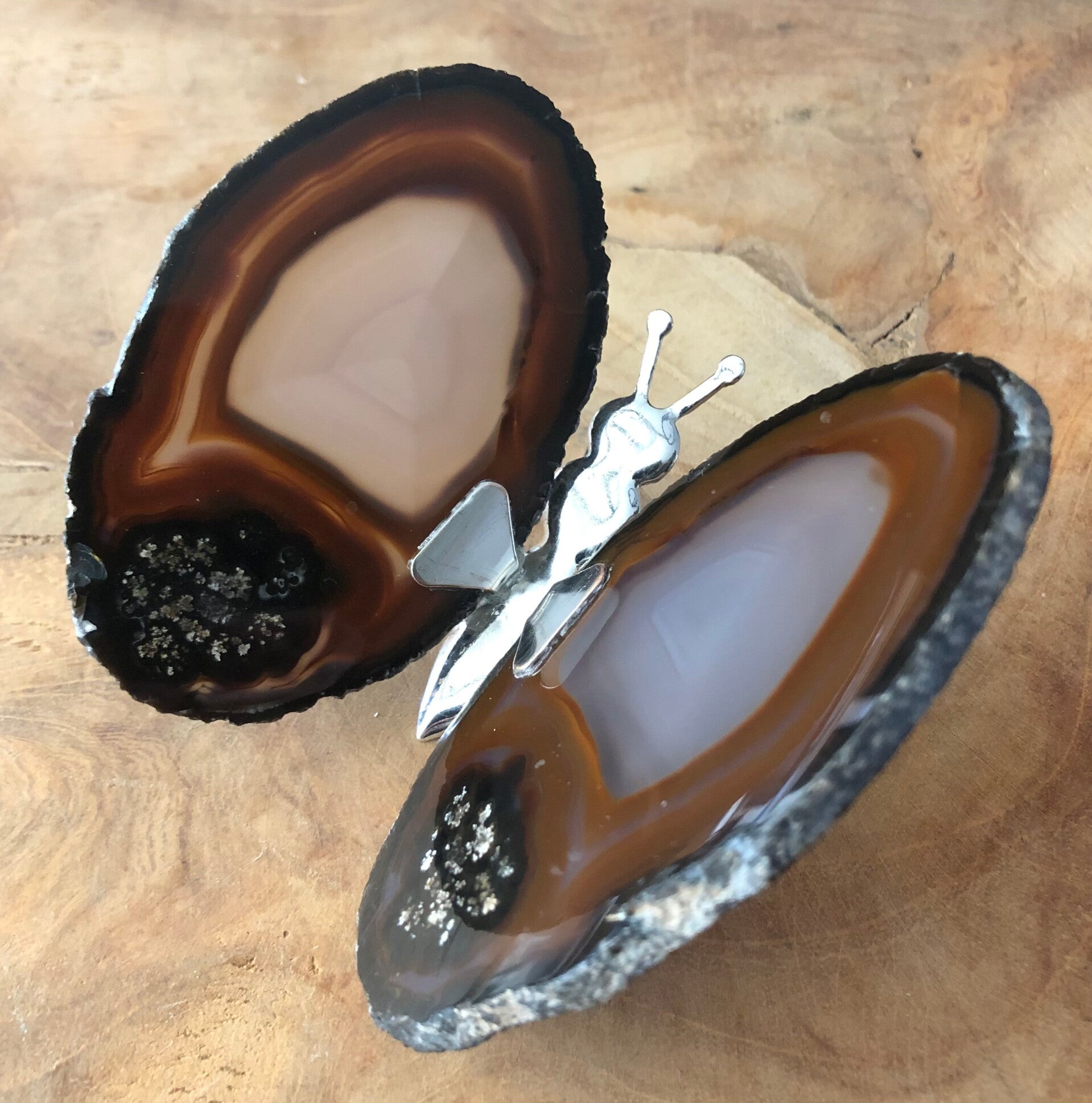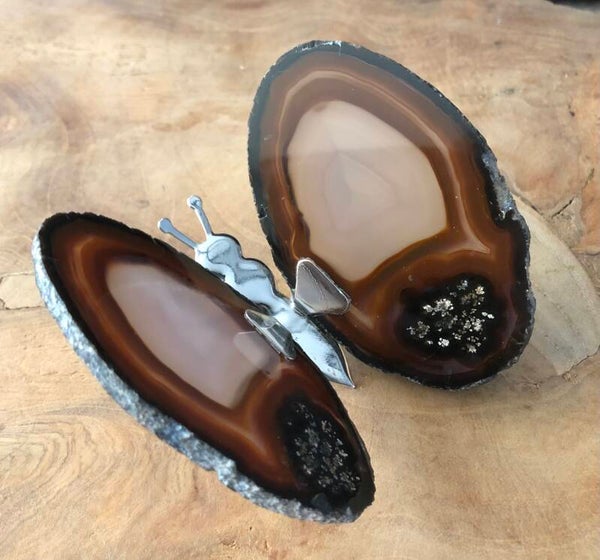 Een vlinder met agaat en metalen lijfje.