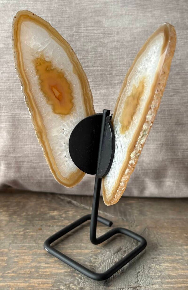Een gedenkvlinder met vleugels van echte agaat, gemonteerd op een metalen standaard. De afmetingen van de vlinder: 17 x 12 cm. De hoogte is inclusief standaard