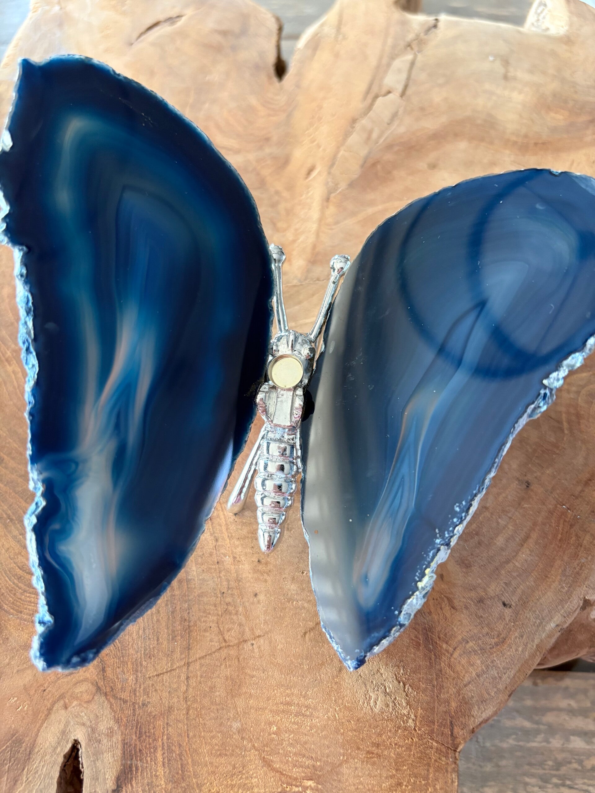 Een gedenkvlinder met vleugels van echte agaat, gemonteerd op een metalen lijfje. De afmetingen van de vlinder: 13,3x12,7 cm