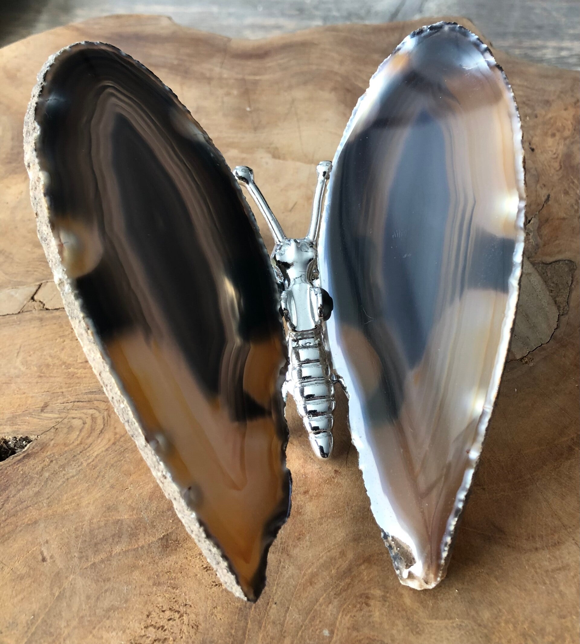 Een gedenkvlinder met vleugels van echte agaat, gemonteerd op een metalen lijfje. De afmetingen van de vlinder: 11x13 cm