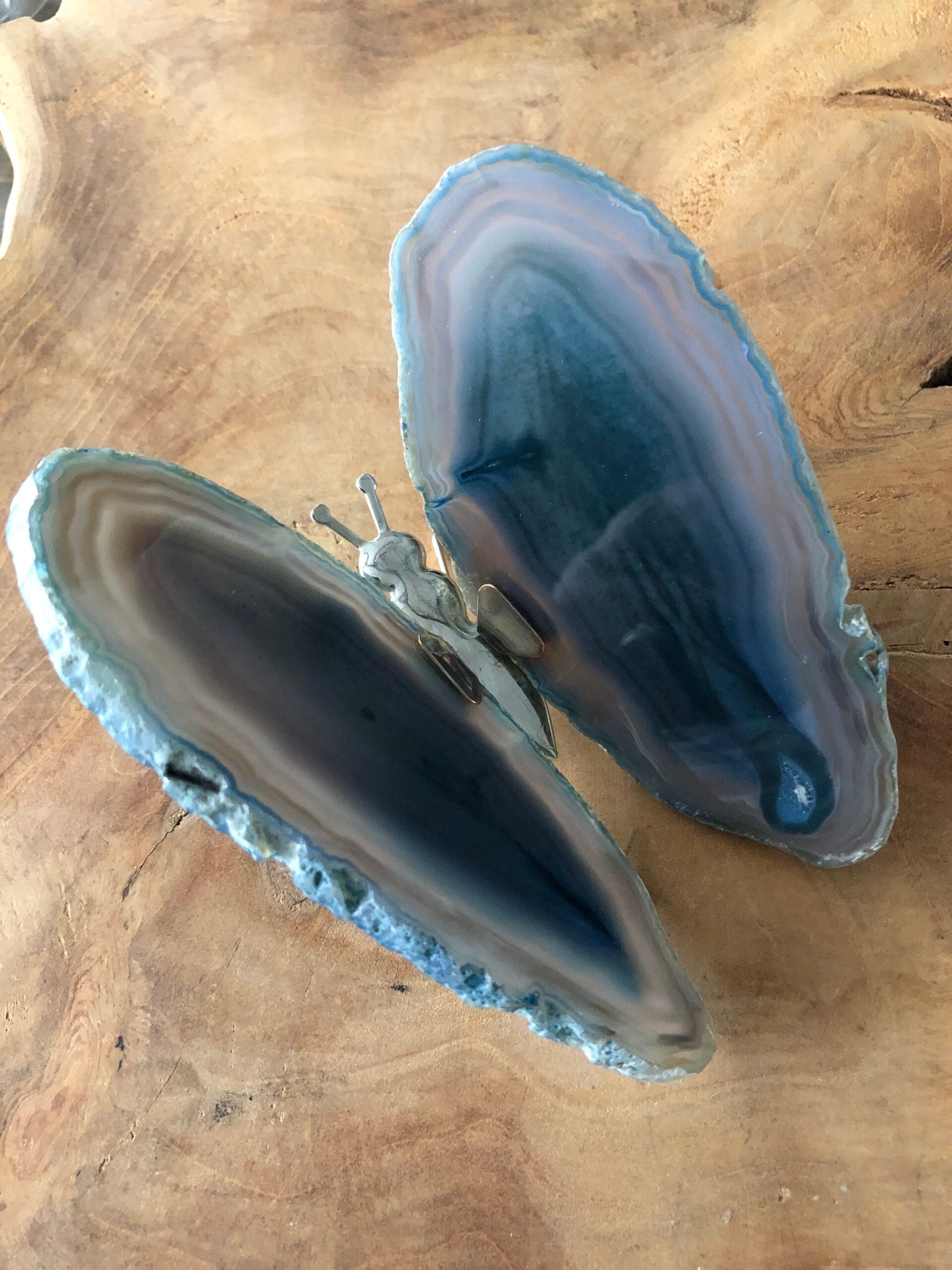 Een gedenkvlinder met vleugels van echte agaat, gemonteerd op een metalen lijfje. De afmetingen van de vlinder: 10x12,4 cm