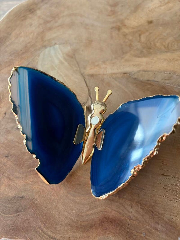 Een gedenkvlinder met vleugels van echte agaat, gemonteerd op een metalen lijfje. De afmetingen van de vlinder: 9,7x7,5 cm