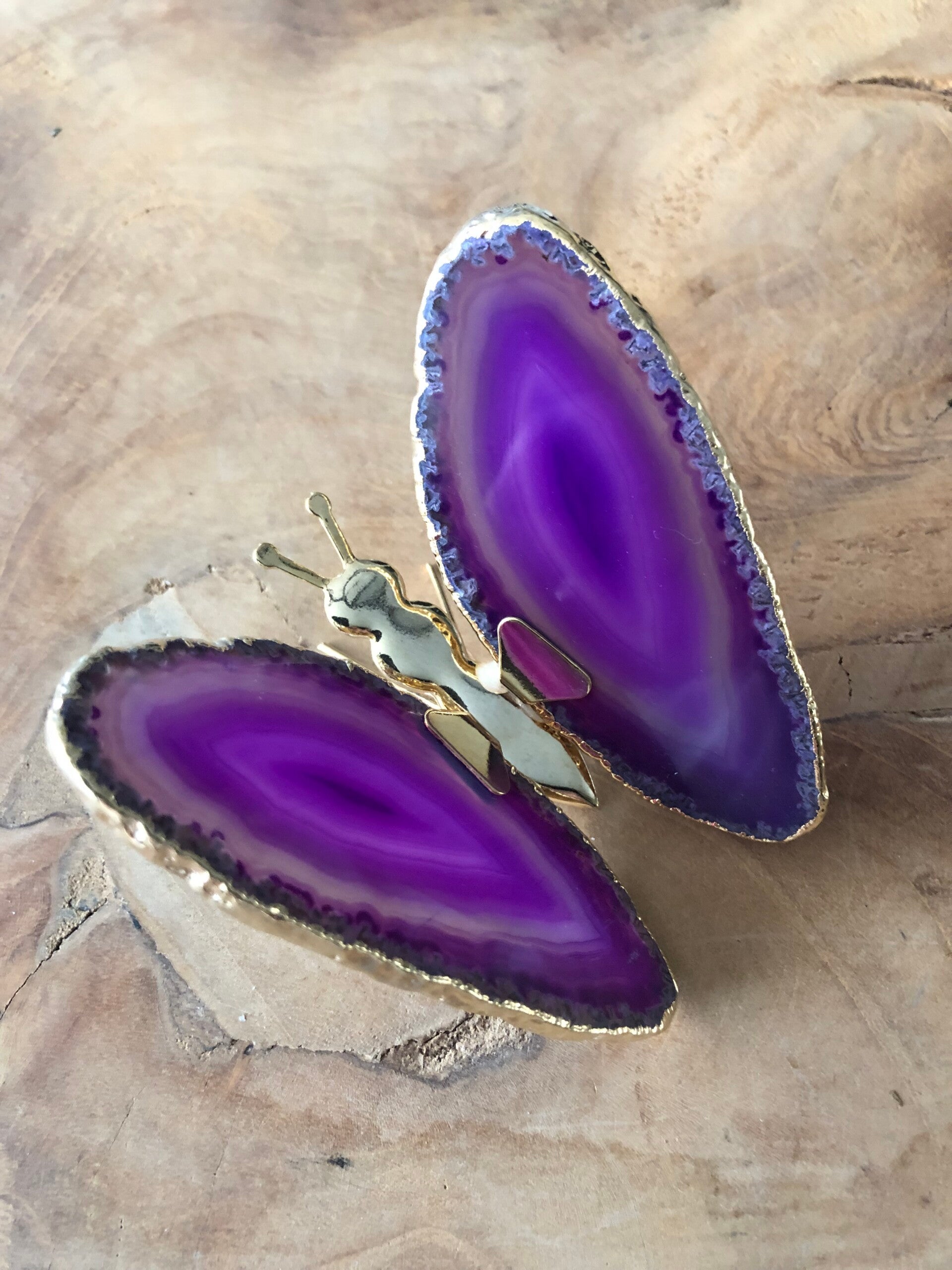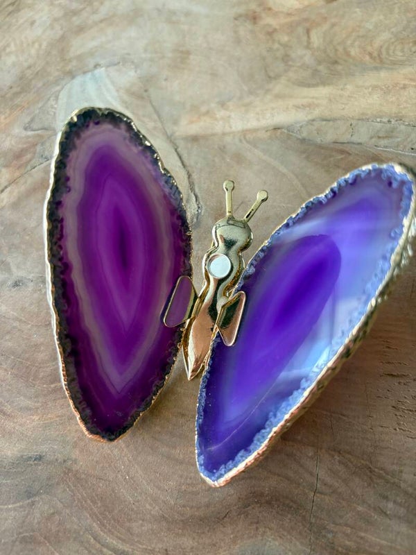 Een gedenkvlinder met vleugels van echte agaat, gemonteerd op een metalen lijfje. De afmetingen van de vlinder: 8x8,2 cm