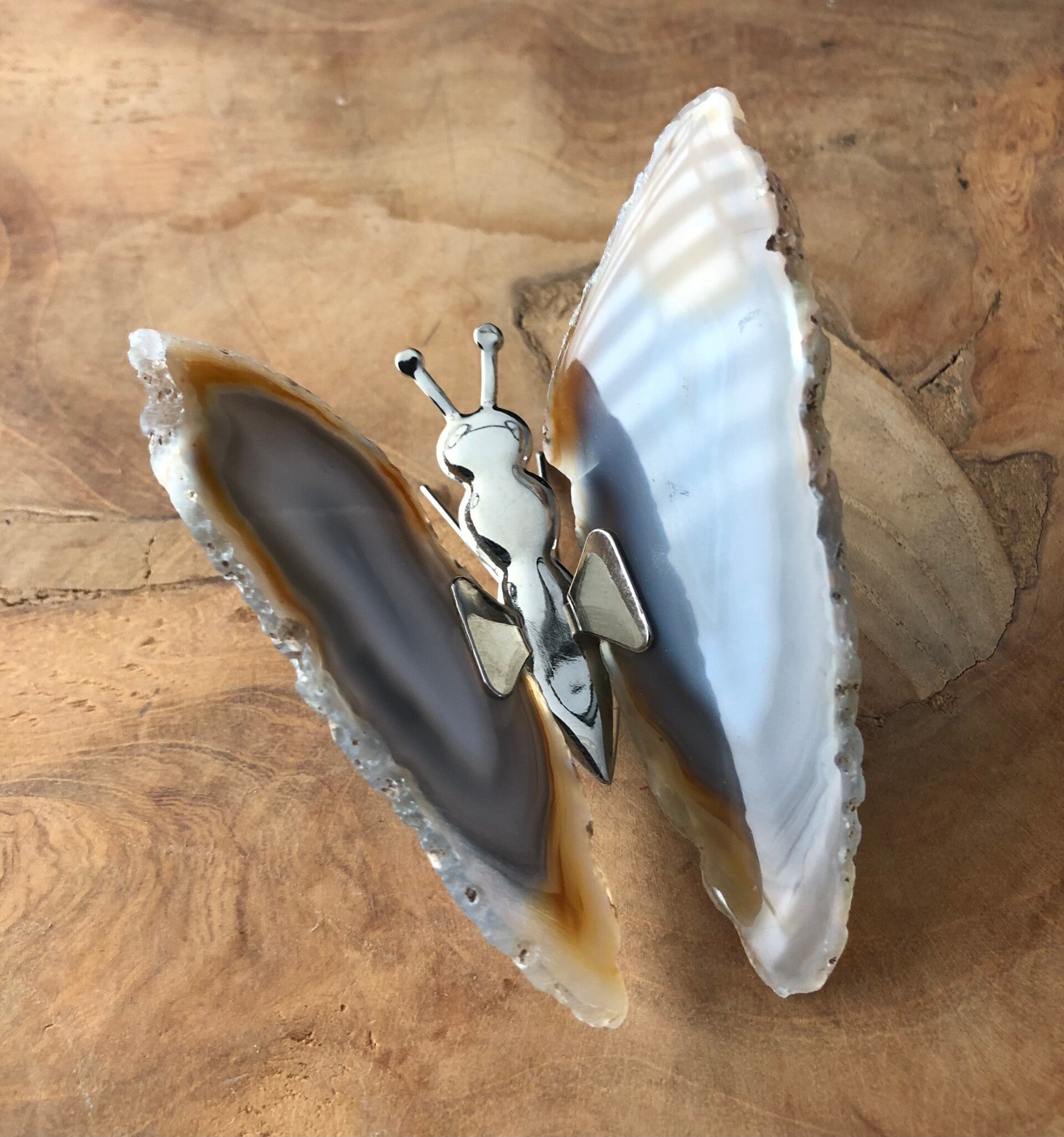 Een gedenkvlinder met vleugels van echte agaat, gemonteerd op een metalen lijfje. De afmetingen van de vlinder: 6,8x9 cm