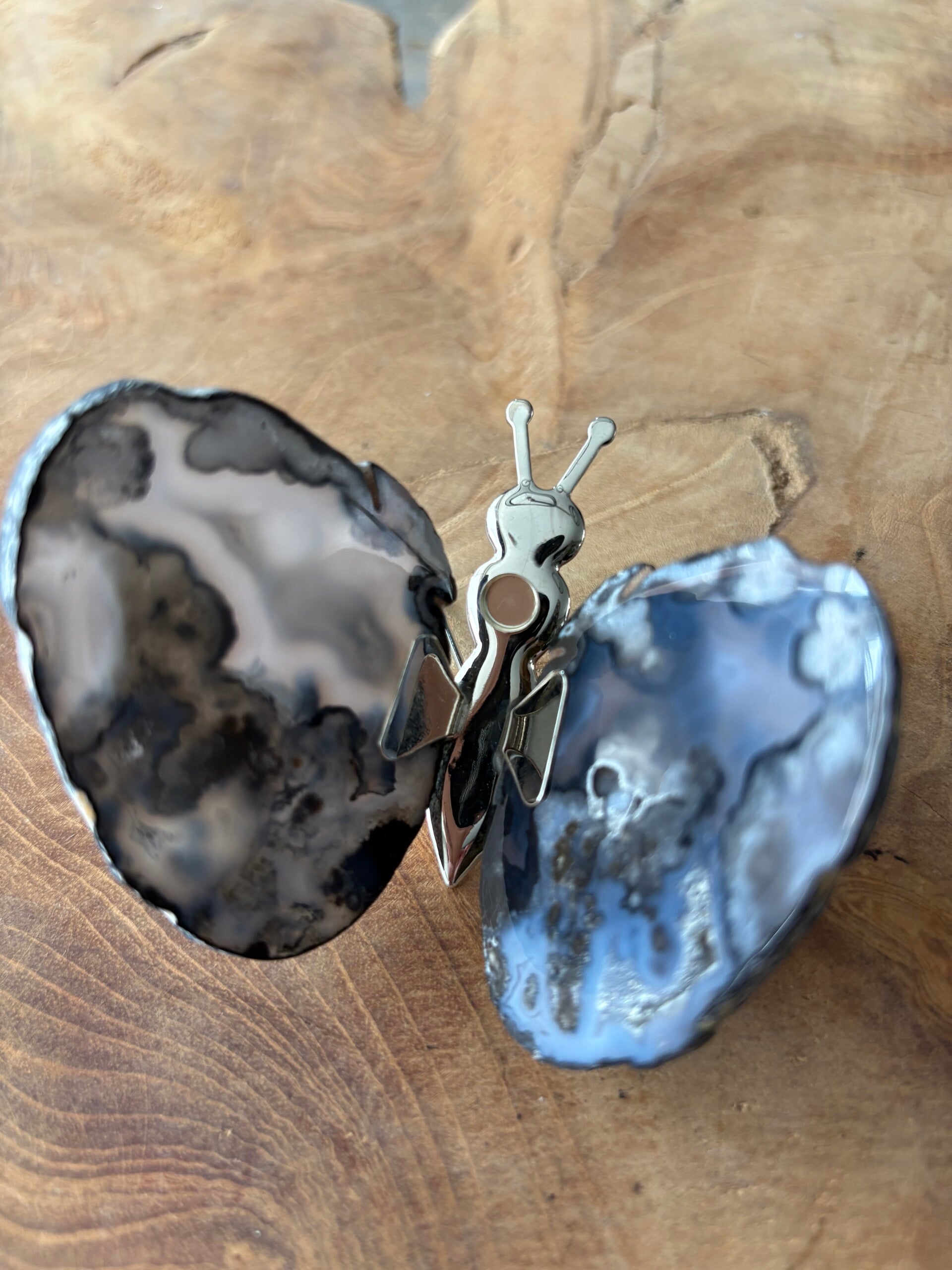 Een gedenkvlinder met vleugels van echte agaat, gemonteerd op een metalen lijfje. De afmetingen van de vlinder: 7,6x5,7 cm