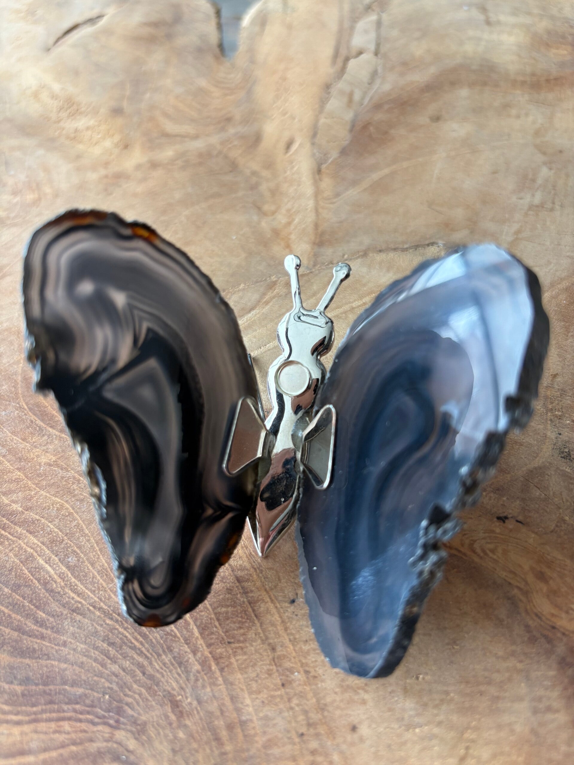Een gedenkvlinder met vleugels van echte agaat, gemonteerd op een metalen lijfje. De afmetingen van de vlinder: 7,4x6,6 cm